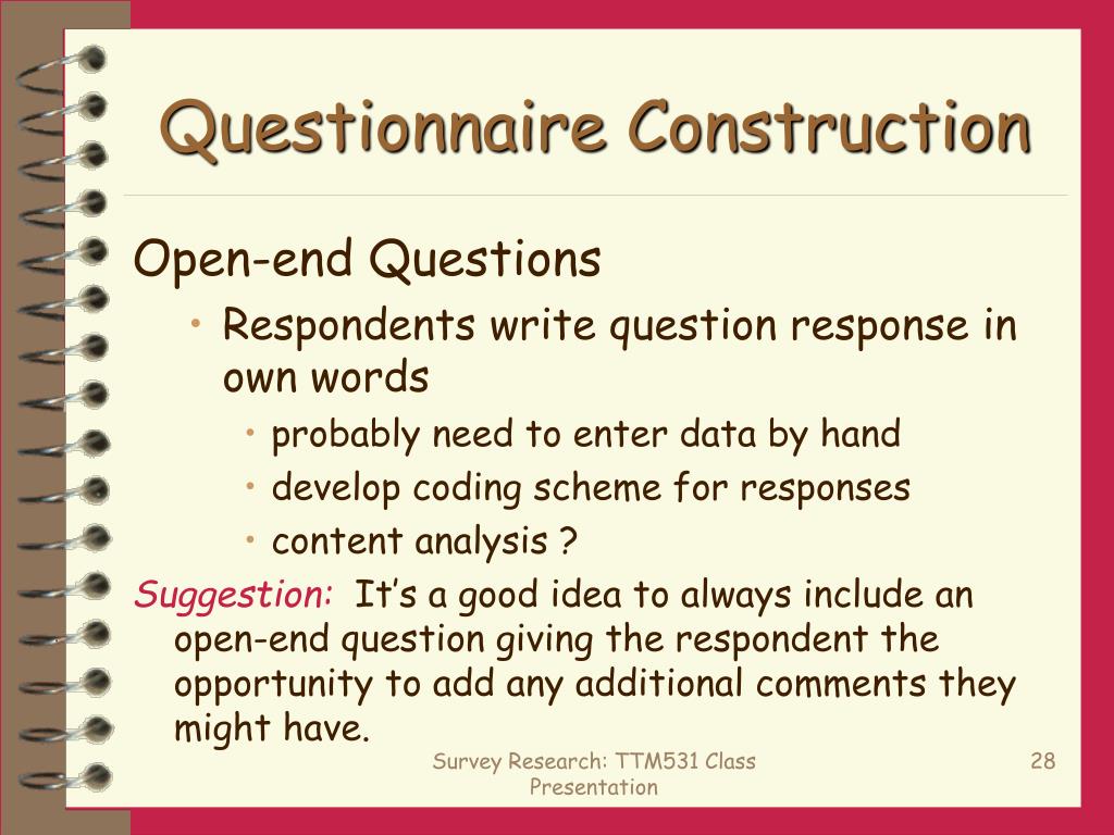 Questionnaire Construction Open-end Questions • Respondents write question response in own words • probably need to enter data by hand • develop coding scheme for responses • content analysis ? Suggestion: It’s a good idea to always include an open-end question giving the respondent the opportunity to add any additional comments they might have. Survey Research: TTM531 Class Presentation