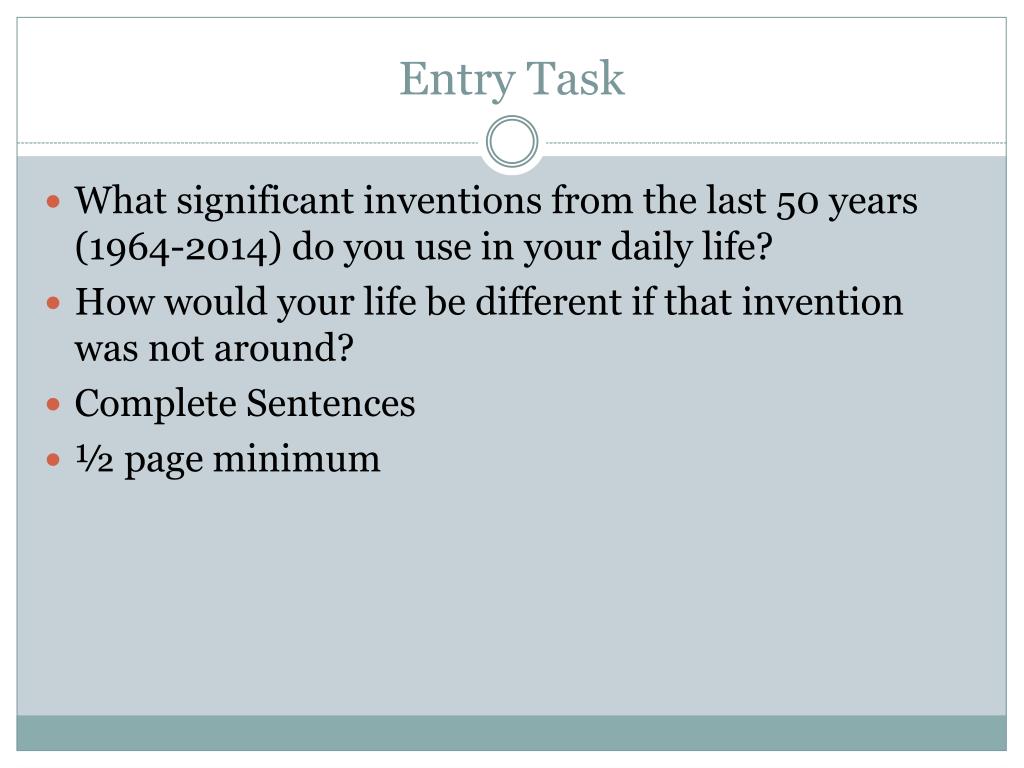 Entry Task • What significant inventions from the last 50 years (1964-2014) do you use in your daily life? • How would your life be different if that invention was not around? • Complete Sentences • ½ page minimum