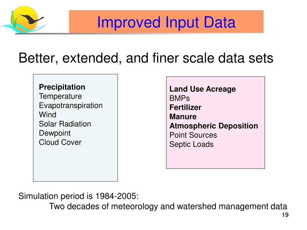 Precipitation Temperature Evapotranspiration Wind Solar Radiation Dewpoint Cloud Cover Land Use Acreage BMPs Fertilizer Manure Atmospheric Deposition Point Sources Septic Loads Better, extended, and finer scale data sets Improved Input Data Simulation period is 1984-2005: Two decades of meteorology and watershed management data 19