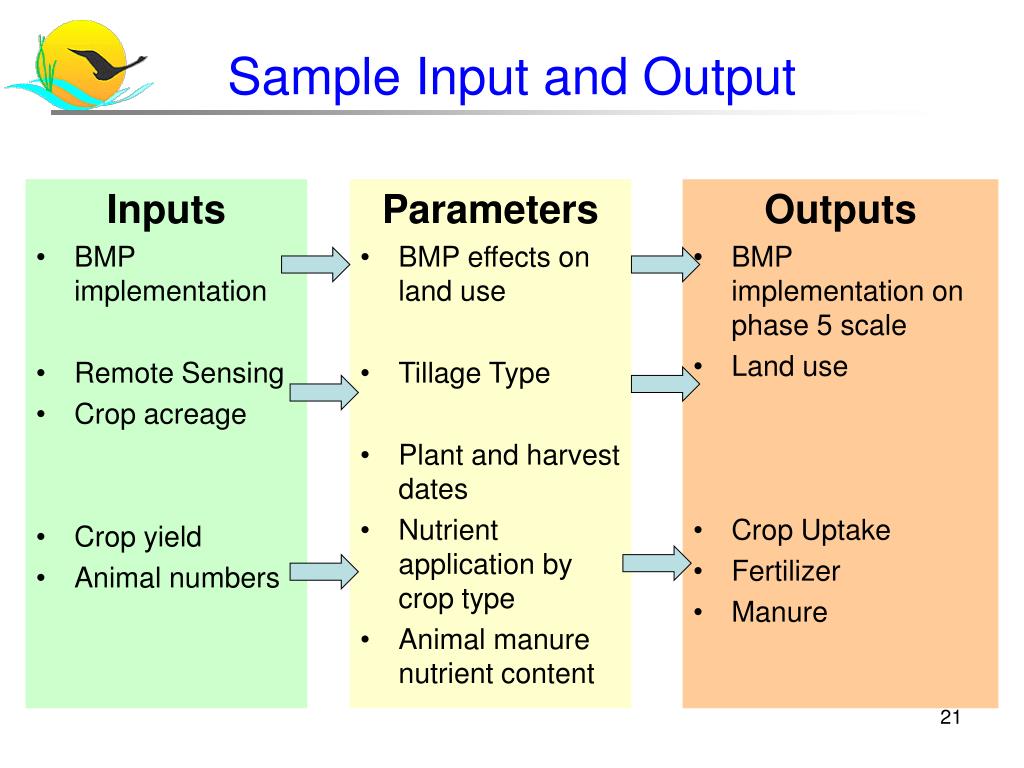 Inputs BMP implementation Remote Sensing Crop acreage Crop yield Animal numbers Outputs BMP implementation on phase 5 scale Land use Crop Uptake Fertilizer Manure Sample Input and Output Parameters • BMP effects on land use • Tillage Type • Plant and harvest dates • Nutrient application by crop type • Animal manure nutrient content