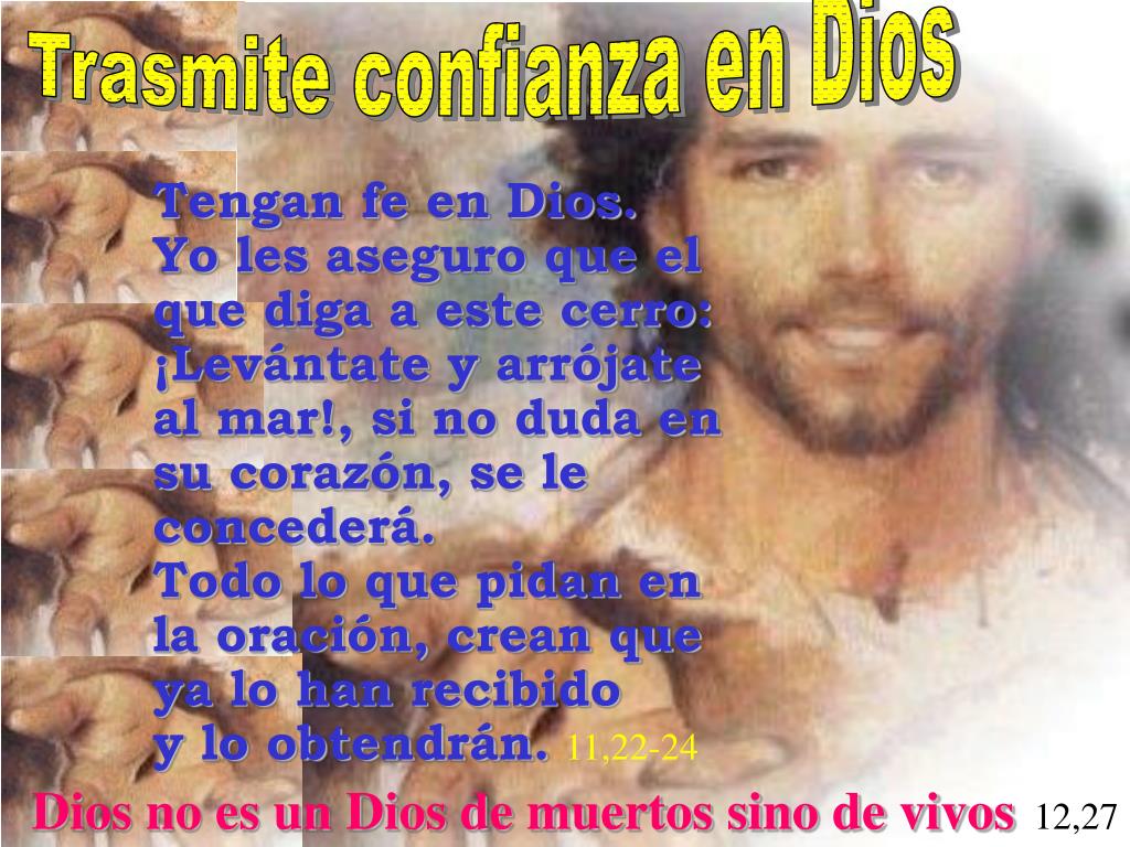 Trasmite confianza en Dios Tengan fe en Dios. Yo les aseguro que el que diga a este cerro: ¡Levántate y arrójate al mar!, si no duda en su corazón, se le concederá. Todo lo que pidan en la oración, crean que ya lo han recibido y lo obtendrán.11,22-24 Dios no es un Dios de muertos sino de vivos 12,27