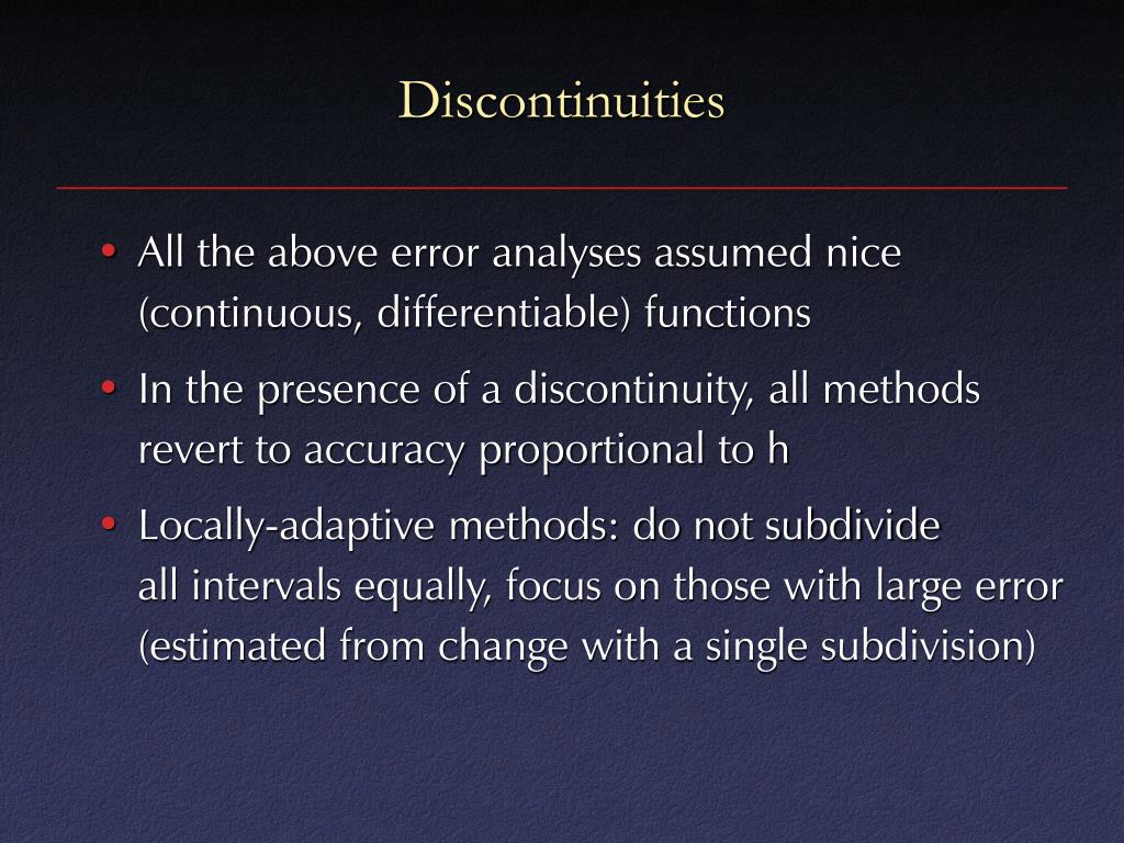 Discontinuities • All the above error analyses assumed nice (continuous, differentiable) functions • In the presence of a discontinuity, all methodsrevert to accuracy proportional to h • Locally-adaptive methods: do not subdivideall intervals equally, focus on those with large error(estimated from change with a single subdivision)