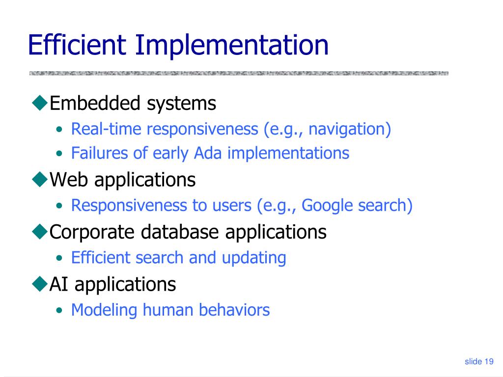 Efficient Implementation • Embedded systems • Real-time responsiveness (e.g., navigation) • Failures of early Ada implementations • Web applications • Responsiveness to users (e.g., Google search) • Corporate database applications • Efficient search and updating • AI applications • Modeling human behaviors