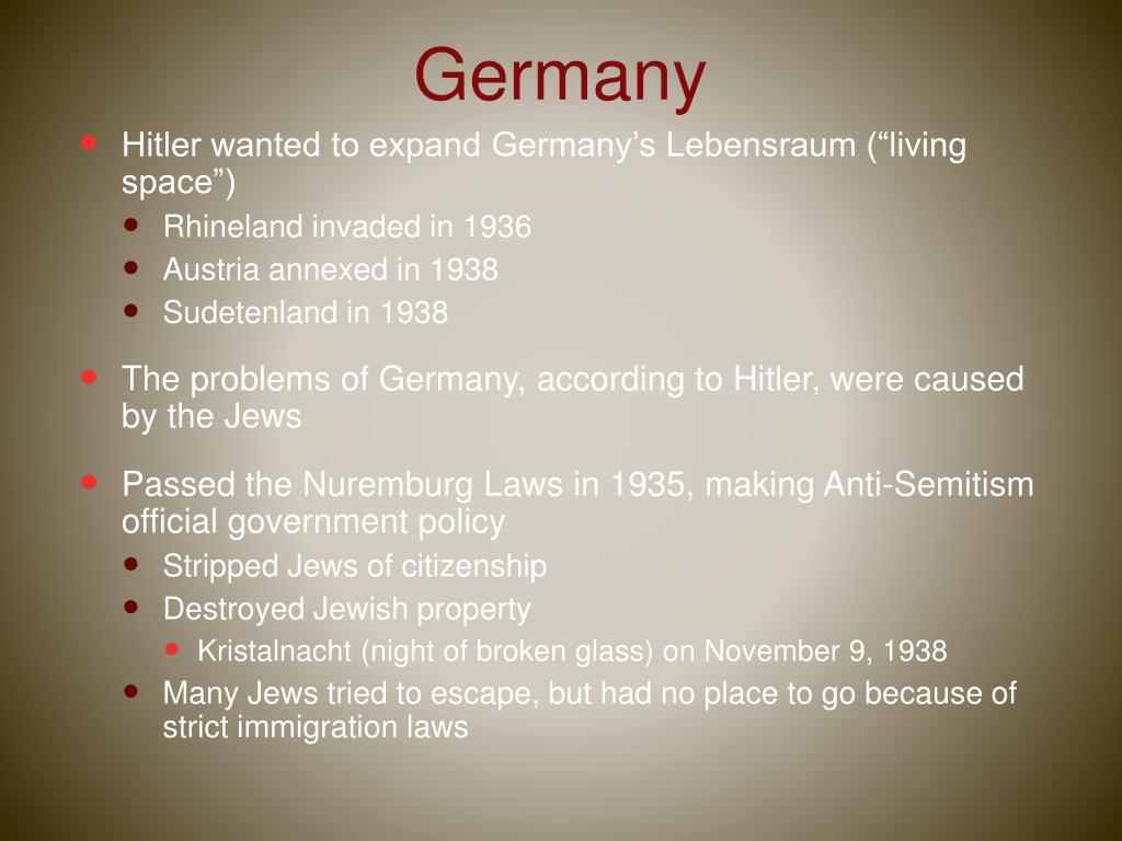 Germany • Hitler wanted to expand Germany’s Lebensraum (“living space”) • Rhineland invaded in 1936 • Austria annexed in 1938 • Sudetenland in 1938 • The problems of Germany, according to Hitler, were caused by the Jews • Passed the Nuremburg Laws in 1935, making Anti-Semitism official government policy • Stripped Jews of citizenship • Destroyed Jewish property • Kristalnacht (night of broken glass) on November 9, 1938 • Many Jews tried to escape, but had no place to go because of strict immigration laws