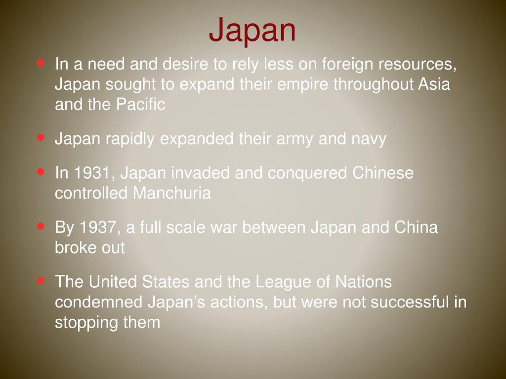 Japan • In a need and desire to rely less on foreign resources, Japan sought to expand their empire throughout Asia and the Pacific • Japan rapidly expanded their army and navy • In 1931, Japan invaded and conquered Chinese controlled Manchuria • By 1937, a full scale war between Japan and China broke out • The United States and the League of Nations condemned Japan’s actions, but were not successful in stopping them