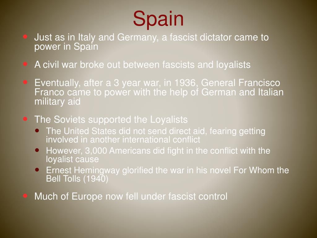 Spain • Just as in Italy and Germany, a fascist dictator came to power in Spain • A civil war broke out between fascists and loyalists • Eventually, after a 3 year war, in 1936, General Francisco Franco came to power with the help of German and Italian military aid • The Soviets supported the Loyalists • The United States did not send direct aid, fearing getting involved in another international conflict • However, 3,000 Americans did fight in the conflict with the loyalist cause • Ernest Hemingway glorified the war in his novel For Whom the Bell Tolls (1940) • Much of Europe now fell under fascist control