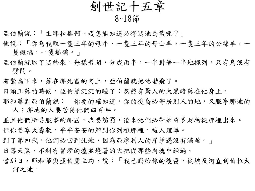 創世記十五章8~18節 亞伯蘭說:「主耶和華啊,我怎能知道必得這地為業呢?」 他說:「你為我取一隻三年的母牛,一隻三年的母山羊,一隻三年的公綿羊,一隻斑鳩,一隻雛鴿。」 亞伯蘭就取了這些來,每樣劈開,分成兩半,一半對著一半地擺列,只有鳥沒有劈開。 有鷙鳥下來,落在那死畜的肉上,亞伯蘭就把他嚇飛了。 日頭正落的時候,亞伯蘭沉沉的睡了;忽然有驚人的大黑暗落在他身上。 耶和華對亞伯蘭說:「你要的確知道,你的後裔必寄居別人的地,又服事那地的人;那地的人要苦待他們四百年。 並且他們所要服事的那國,我要懲罰,後來他們必帶著許多財物從那裡出來。 但你要享大壽數,平平安安的歸到你列祖那裡,被人埋葬。 到了第四代,他們必回到此地,因為亞摩利人的罪孽還沒有滿盈。」 日落天黑,不料有冒煙的爐並燒著的火把從那些肉塊中經過。 當那日,耶和華與亞伯蘭立約,說:「我已賜給你的後裔,從埃及河直到伯拉大河之地,