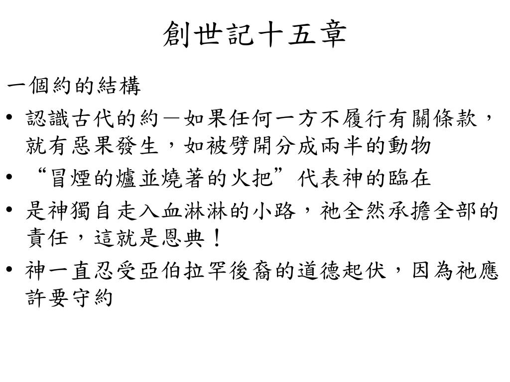 創世記十五章 一個約的結構 • 認識古代的約-如果任何一方不履行有關條款,就有惡果發生,如被劈開分成兩半的動物 • “冒煙的爐並燒著的火把”代表神的臨在 • 是神獨自走入血淋淋的小路,祂全然承擔全部的責任,這就是恩典! • 神一直忍受亞伯拉罕後裔的道德起伏,因為祂應許要守約