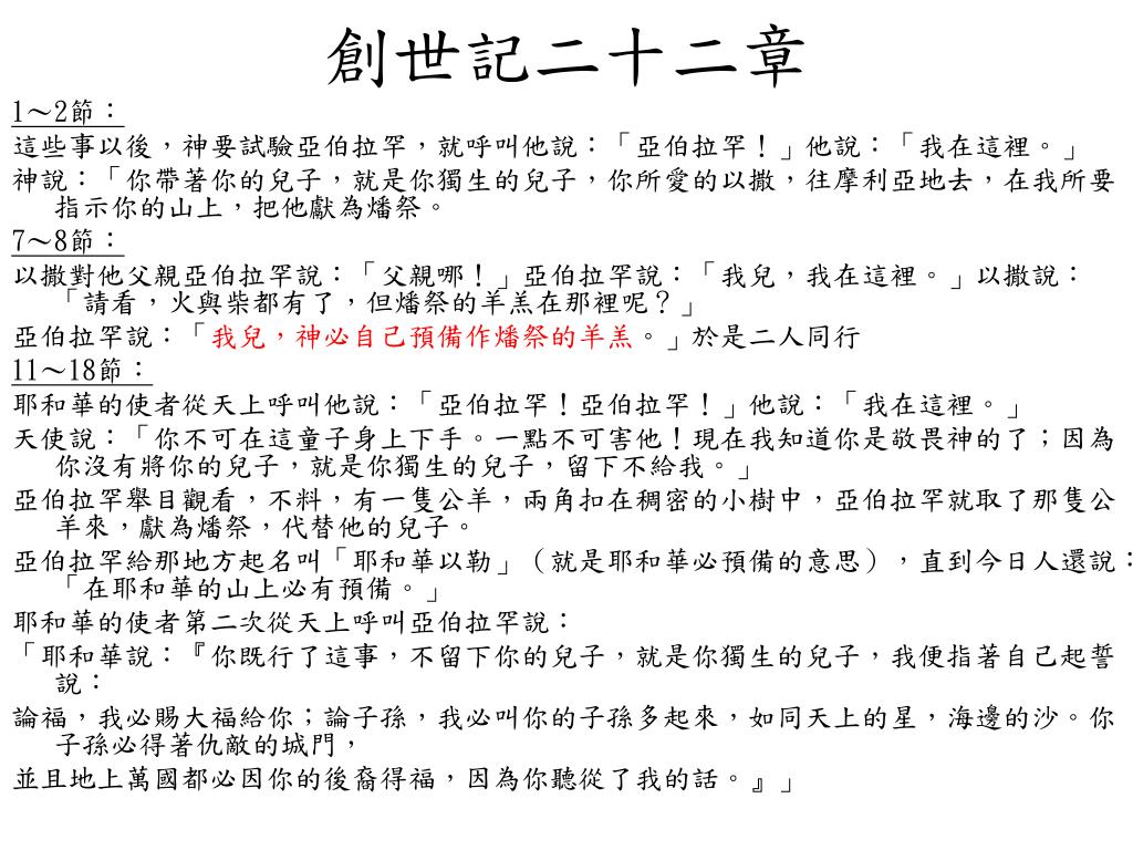 創世記二十二章 1~2節: 這些事以後,神要試驗亞伯拉罕,就呼叫他說:「亞伯拉罕!」他說:「我在這裡。」 神說:「你帶著你的兒子,就是你獨生的兒子,你所愛的以撒,往摩利亞地去,在我所要指示你的山上,把他獻為燔祭。 7~8節: 以撒對他父親亞伯拉罕說:「父親哪!」亞伯拉罕說:「我兒,我在這裡。」以撒說:「請看,火與柴都有了,但燔祭的羊羔在那裡呢?」 亞伯拉罕說:「我兒,神必自己預備作燔祭的羊羔。」於是二人同行 11~18節: 耶和華的使者從天上呼叫他說:「亞伯拉罕!亞伯拉罕!」他說:「我在這裡。」 天使說:「你不可在這童子身上下手。一點不可害他!現在我知道你是敬畏神的了;因為你沒有將你的兒子,就是你獨生的兒子,留下不給我。」 亞伯拉罕舉目觀看,不料,有一隻公羊,兩角扣在稠密的小樹中,亞伯拉罕就取了那隻公羊來,獻為燔祭,代替他的兒子。 亞伯拉罕給那地方起名叫「耶和華以勒」(就是耶和華必預備的意思),直到今日人還說:「在耶和華的山上必有預備。」 耶和華的使者第二次從天上呼叫亞伯拉罕說: 「耶和華說:『你既行了這事,不留下你的兒子,就是你獨生的兒子,我便指著自己起誓說: 論福,我必賜大福給你;論子孫,我必叫你的子孫多起來,如同天上的星,海邊的沙。你子孫必得著仇敵的城門, 並且地上萬國都必因你的後裔得福,因為你聽從了我的話。』」
