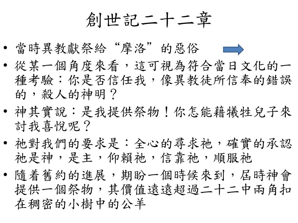 創世記二十二章 • 當時異教獻祭給“摩洛”的惡俗 • 從某一個角度來看,這可視為符合當日文化的一種考驗:你是否信任我,像異教徒所信奉的錯誤的,殺人的神明? • 神其實說:是我提供祭物!你怎能藉犧牲兒子來討我喜悅呢? • 祂對我們的要求是:全心的尋求祂,確實的承認,祂是神,是主,仰賴祂,信靠祂,順服祂 • 隨着舊約的進展,期盼一個時候來到,屆時神會提供一個祭物,其價值遠遠超過二十二中兩角扣在稠密的小樹中的公羊