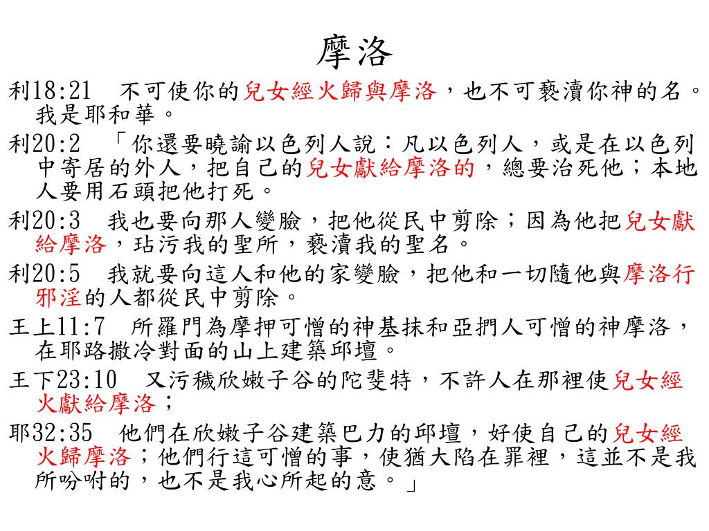 摩洛 利18:21 不可使你的兒女經火歸與摩洛,也不可褻瀆你神的名。我是耶和華。 利20:2 「你還要曉諭以色列人說:凡以色列人,或是在以色列中寄居的外人,把自己的兒女獻給摩洛的,總要治死他;本地人要用石頭把他打死。 利20:3 我也要向那人變臉,把他從民中剪除;因為他把兒女獻給摩洛,玷污我的聖所,褻瀆我的聖名。 利20:5 我就要向這人和他的家變臉,把他和一切隨他與摩洛行邪淫的人都從民中剪除。 王上11:7 所羅門為摩押可憎的神基抹和亞捫人可憎的神摩洛,在耶路撒冷對面的山上建築邱壇。 王下23:10 又污穢欣嫩子谷的陀斐特,不許人在那裡使兒女經火獻給摩洛; 耶32:35 他們在欣嫩子谷建築巴力的邱壇,好使自己的兒女經火歸摩洛;他們行這可憎的事,使猶大陷在罪裡,這並不是我所吩咐的,也不是我心所起的意。」