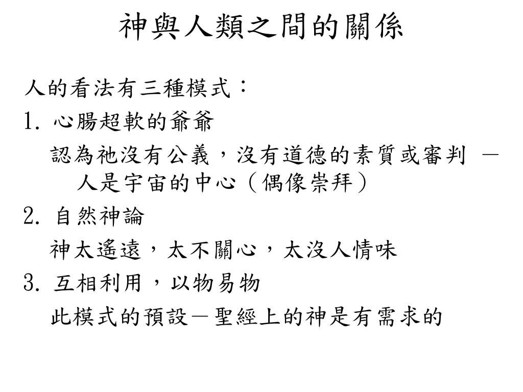 神與人類之間的關係 人的看法有三種模式: • 心腸超軟的爺爺 認為祂沒有公義,沒有道德的素質或審判 - 人是宇宙的中心(偶像崇拜) • 自然神論 神太遙遠,太不關心,太沒人情味 • 互相利用,以物易物 此模式的預設-聖經上的神是有需求的