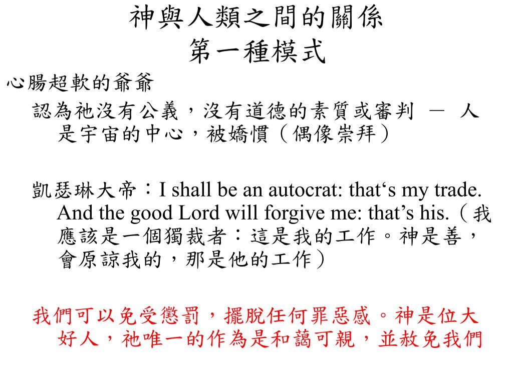 神與人類之間的關係第一種模式 心腸超軟的爺爺 認為祂沒有公義,沒有道德的素質或審判 - 人是宇宙的中心,被嬌慣(偶像崇拜) 凱瑟琳大帝:I shall be an autocrat: that‘s my trade. And the good Lord will forgive me: that’s his.(我應該是一個獨裁者:這是我的工作。神是善,會原諒我的,那是他的工作) 我們可以免受懲罰,擺脫任何罪惡感。神是位大好人,祂唯一的作為是和藹可親,並赦免我們