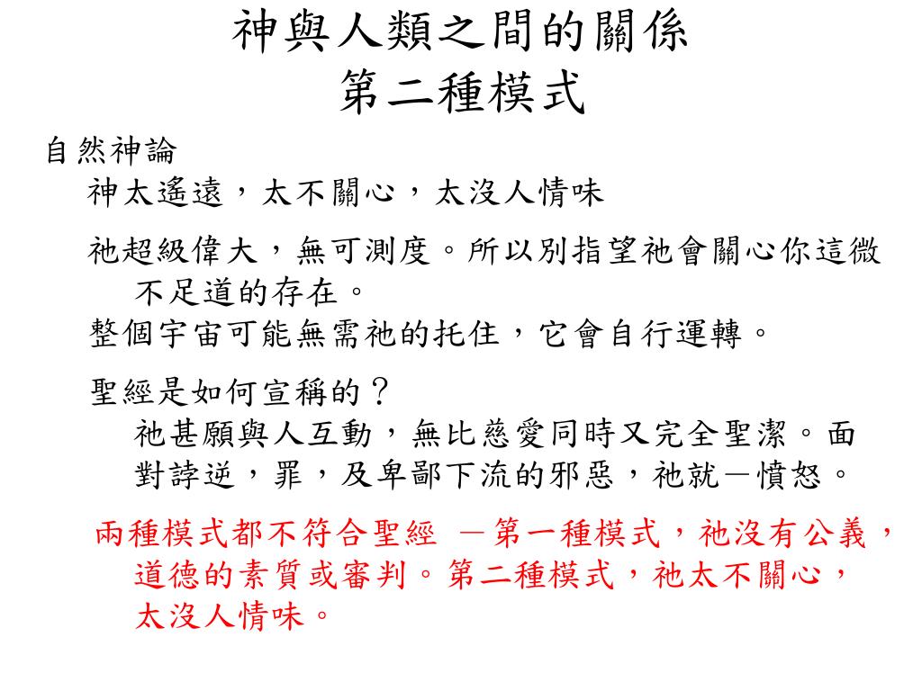 神與人類之間的關係第二種模式 自然神論 神太遙遠,太不關心,太沒人情味 祂超級偉大,無可測度。所以別指望祂會關心你這微不足道的存在。 整個宇宙可能無需祂的托住,它會自行運轉。 聖經是如何宣稱的? 祂甚願與人互動,無比慈愛同時又完全聖潔。面對誖逆,罪,及卑鄙下流的邪惡,祂就-憤怒。 兩種模式都不符合聖經 -第一種模式,祂沒有公義,道德的素質或審判。第二種模式,祂太不關心,太沒人情味。