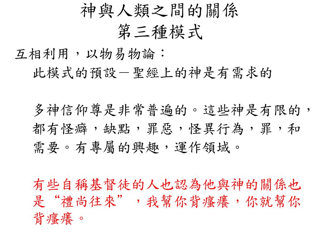 神與人類之間的關係第三種模式 互相利用,以物易物論: 此模式的預設-聖經上的神是有需求的 多神信仰尊是非常普遍的。這些神是有限的,都有怪癖,缺點,罪惡,怪異行為,罪,和需要。有專屬的興趣,運作領域。 有些自稱基督徒的人也認為他與神的關係也是“禮尚往來”,我幫你背瘙癢,你就幫你背瘙癢。