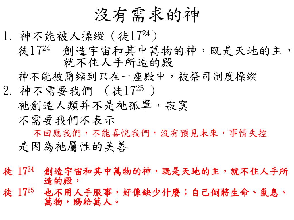 沒有需求的神 • 神不能被人操縱(徒1724) 徒1724創造宇宙和其中萬物的神,既是天地的主, 就不住人手所造的殿 神不能被簡縮到只在一座殿中,被祭司制度操縱 • 神不需要我們 (徒1725 ) 祂創造人類并不是祂孤單,寂寞 不需要我們不表示 不回應我們,不能喜悅我們,沒有預見未來,事情失控 是因為祂屬性的美善 徒 1724創造宇宙和其中萬物的神,既是天地的主,就不住人手所造的殿, 徒 1725也不用人手服事,好像缺少什麼;自己倒將生命、氣息、萬物,賜給萬人。