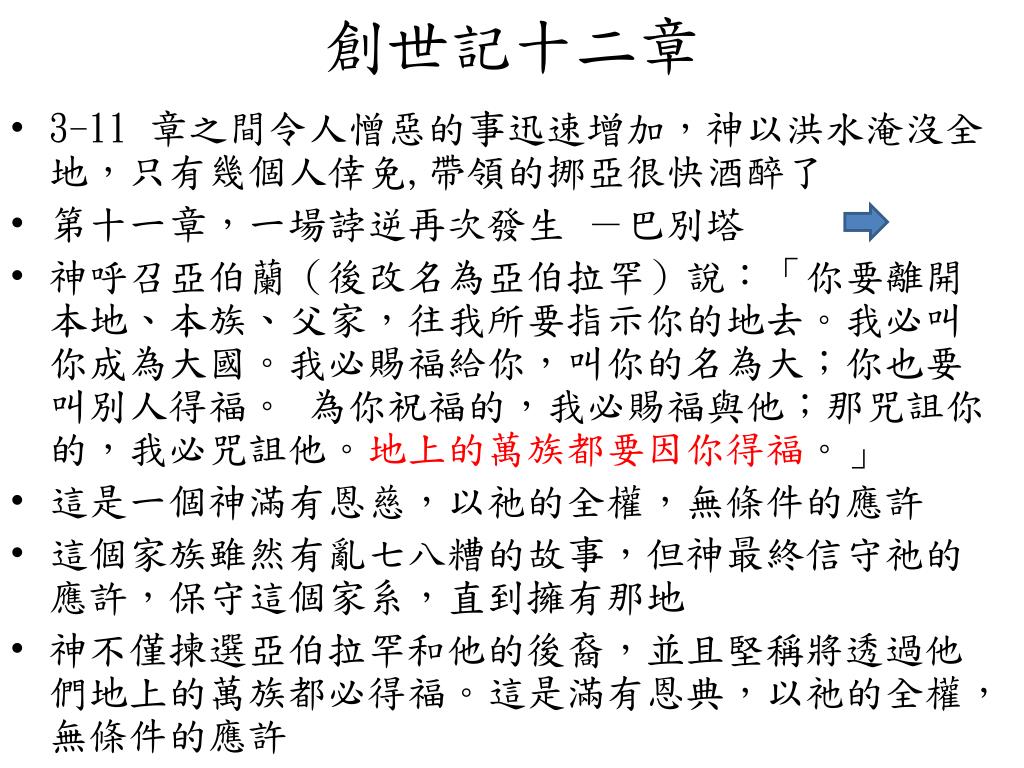 創世記十二章 • 3-11 章之間令人憎惡的事迅速增加,神以洪水淹沒全地,只有幾個人倖免,帶領的挪亞很快酒醉了 • 第十一章,一場誖逆再次發生 -巴別塔 • 神呼召亞伯蘭(後改名為亞伯拉罕)說:「你要離開本地、本族、父家,往我所要指示你的地去。我必叫你成為大國。我必賜福給你,叫你的名為大;你也要叫別人得福。為你祝福的,我必賜福與他;那咒詛你的,我必咒詛他。地上的萬族都要因你得福。」 • 這是一個神滿有恩慈,以祂的全權,無條件的應許 • 這個家族雖然有亂七八糟的故事,但神最終信守祂的應許,保守這個家系,直到擁有那地 • 神不僅揀選亞伯拉罕和他的後裔,並且堅稱將透過他們地上的萬族都必得福。這是滿有恩典,以祂的全權,無條件的應許