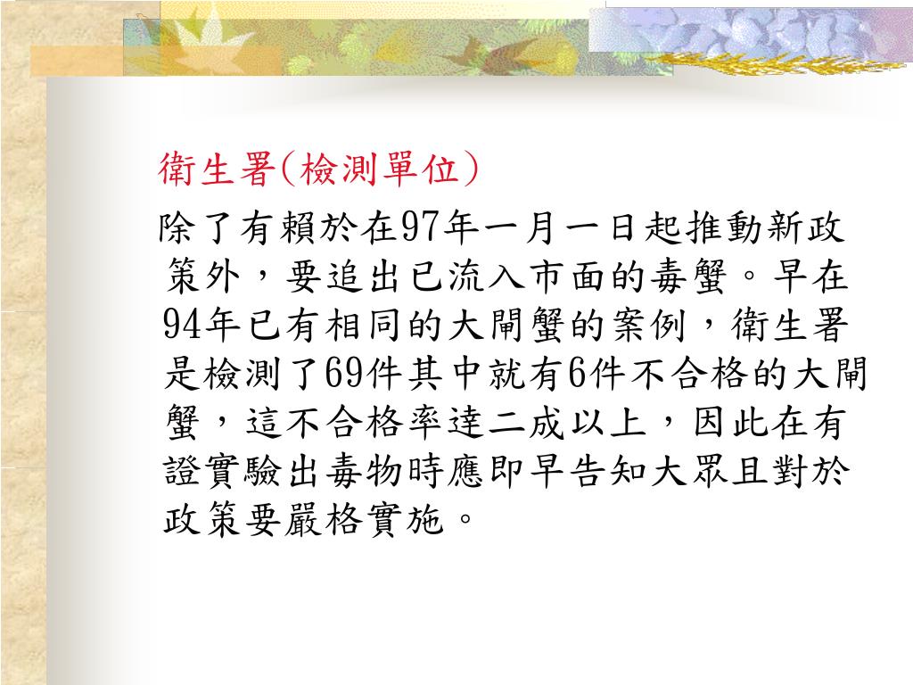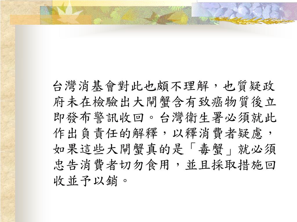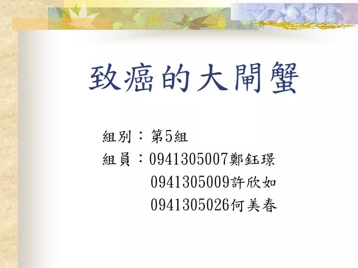 致癌的大閘蟹 組別:第5組 組員:0941305007鄭鈺璟 0941305009許欣如 0941305026何美春
