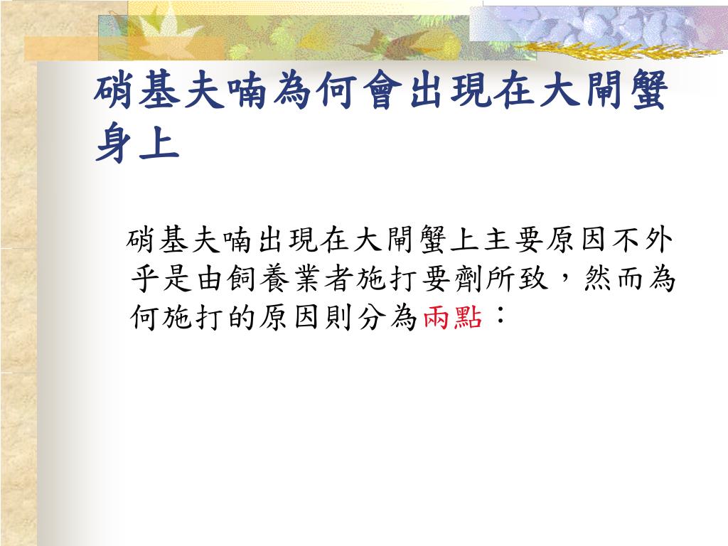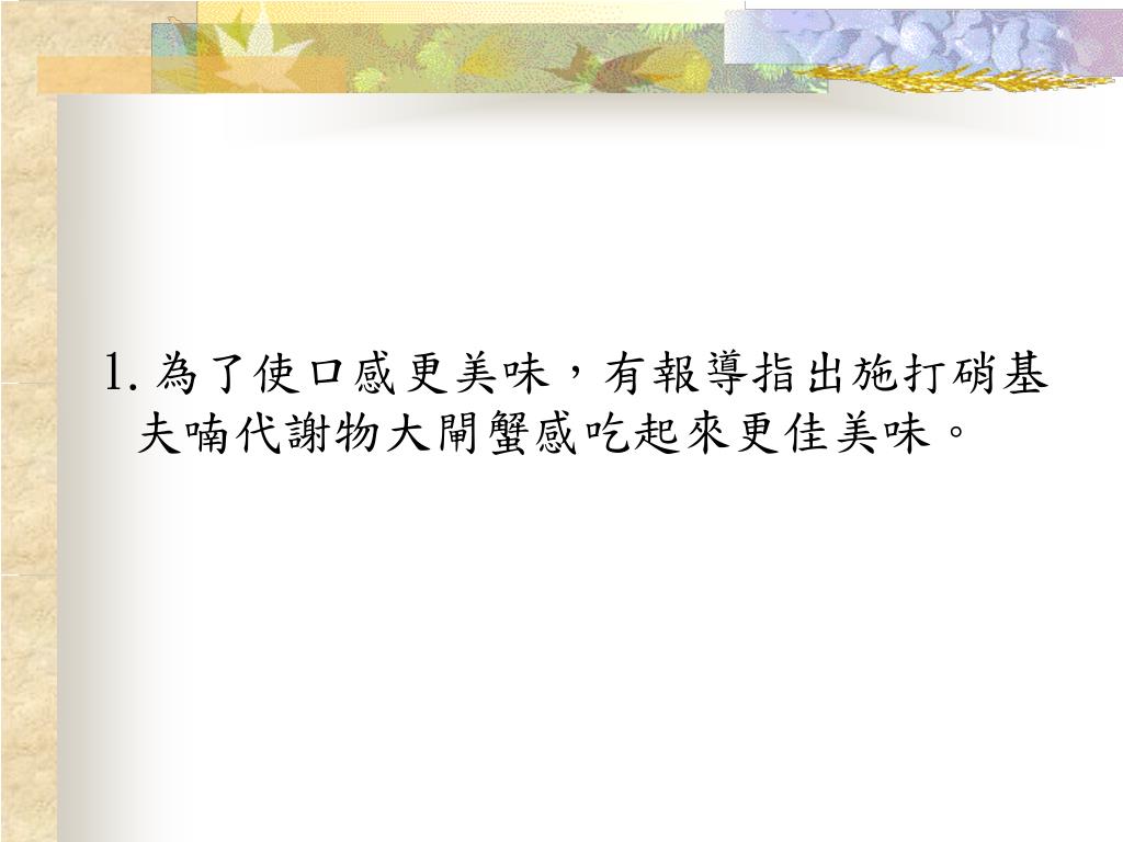 1.為了使口感更美味,有報導指出施打硝基夫喃代謝物大閘蟹感吃起來更佳美味。 1.為了使口感更美味,有報導指出施打硝基夫喃代謝物大閘蟹感吃起來更佳美味。