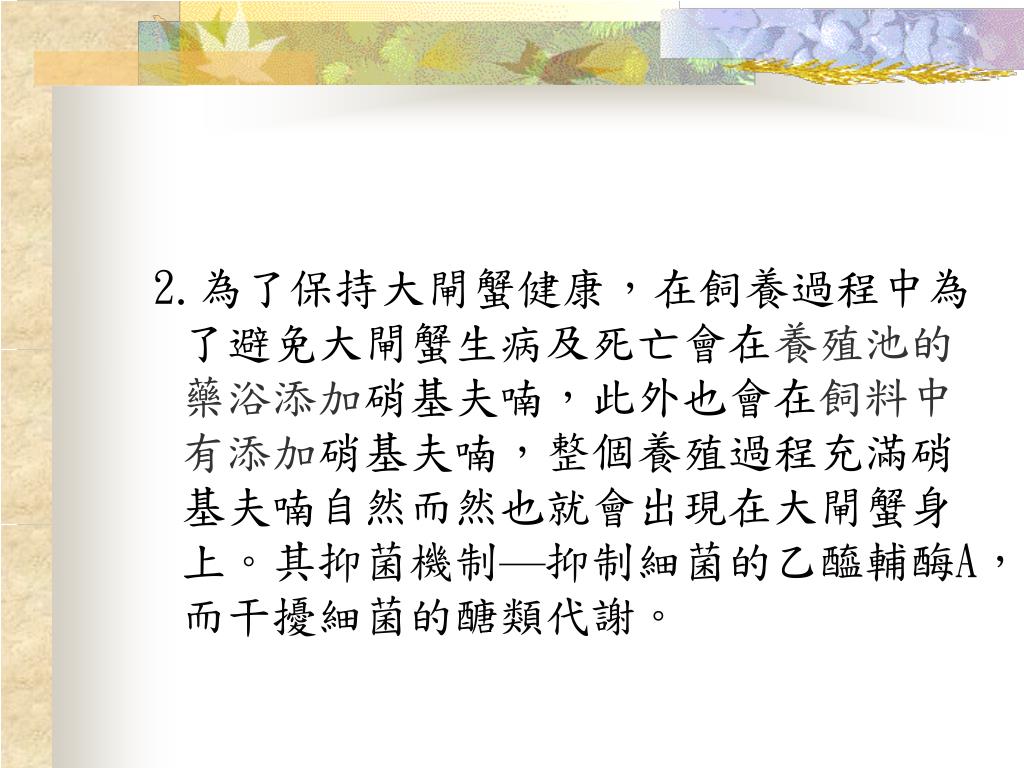 2.為了保持大閘蟹健康,在飼養過程中為了避免大閘蟹生病及死亡會在養殖池的藥浴添加硝基夫喃,此外也會在飼料中有添加硝基夫喃,整個養殖過程充滿硝基夫喃自然而然也就會出現在大閘蟹身上。其抑菌機制—抑制細菌的乙醯輔酶A,而干擾細菌的醣類代謝。 2.為了保持大閘蟹健康,在飼養過程中為了避免大閘蟹生病及死亡會在養殖池的藥浴添加硝基夫喃,此外也會在飼料中有添加硝基夫喃,整個養殖過程充滿硝基夫喃自然而然也就會出現在大閘蟹身上。其抑菌機制—抑制細菌的乙醯輔酶A,而干擾細菌的醣類代謝。