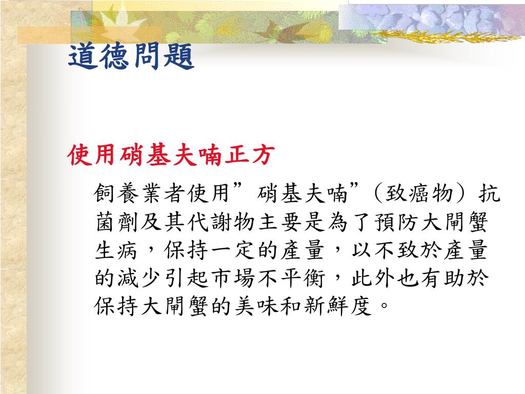 道德問題 使用硝基夫喃正方 飼養業者使用”硝基夫喃”(致癌物) 抗菌劑及其代謝物主要是為了預防大閘蟹生病,保持一定的產量,以不致於產量的減少引起市場不平衡,此外也有助於保持大閘蟹的美味和新鮮度。