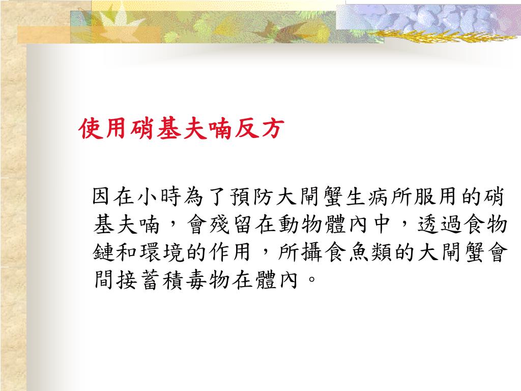 使用硝基夫喃反方 因在小時為了預防大閘蟹生病所服用的硝基夫喃,會殘留在動物體內中,透過食物鏈和環境的作用,所攝食魚類的大閘蟹會間接蓄積毒物在體內。