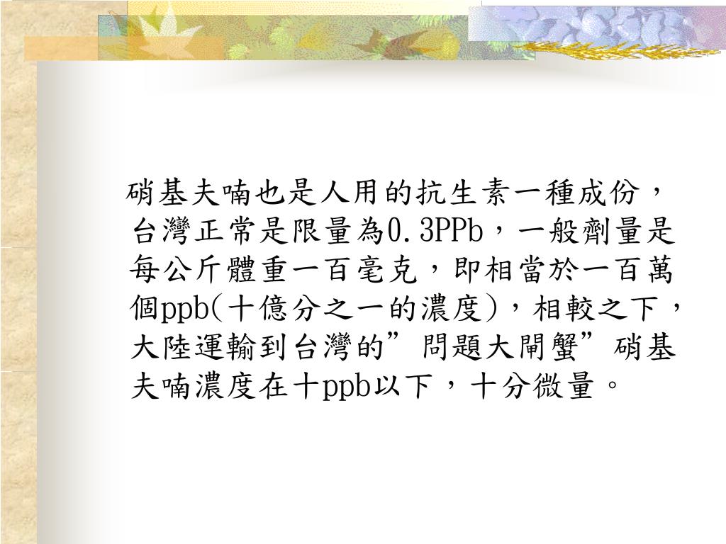 硝基夫喃也是人用的抗生素一種成份,台灣正常是限量為0.3PPb,一般劑量是每公斤體重一百毫克,即相當於一百萬個ppb(十億分之一的濃度),相較之下,大陸運輸到台灣的”問題大閘蟹”硝基夫喃濃度在十ppb以下,十分微量。