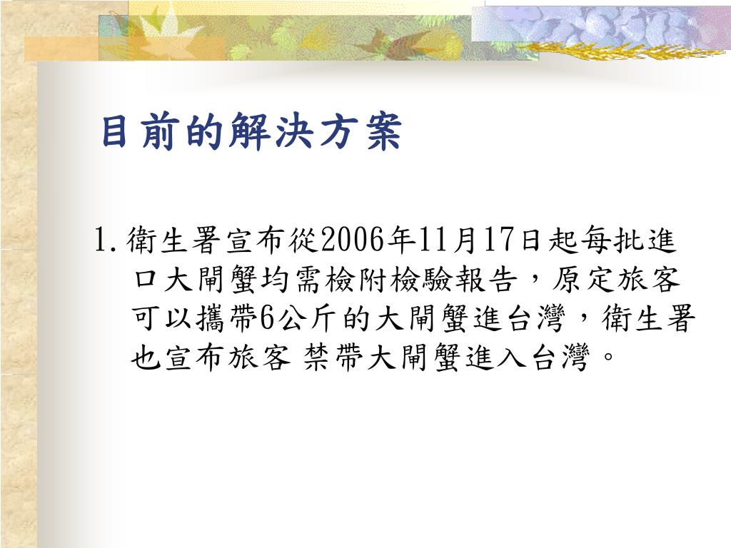 目前的解決方案 1.衛生署宣布從2006年11月17日起每批進口大閘蟹均需檢附檢驗報告,原定旅客可以攜帶6公斤的大閘蟹進台灣,衛生署也宣布旅客禁帶大閘蟹進入台灣。