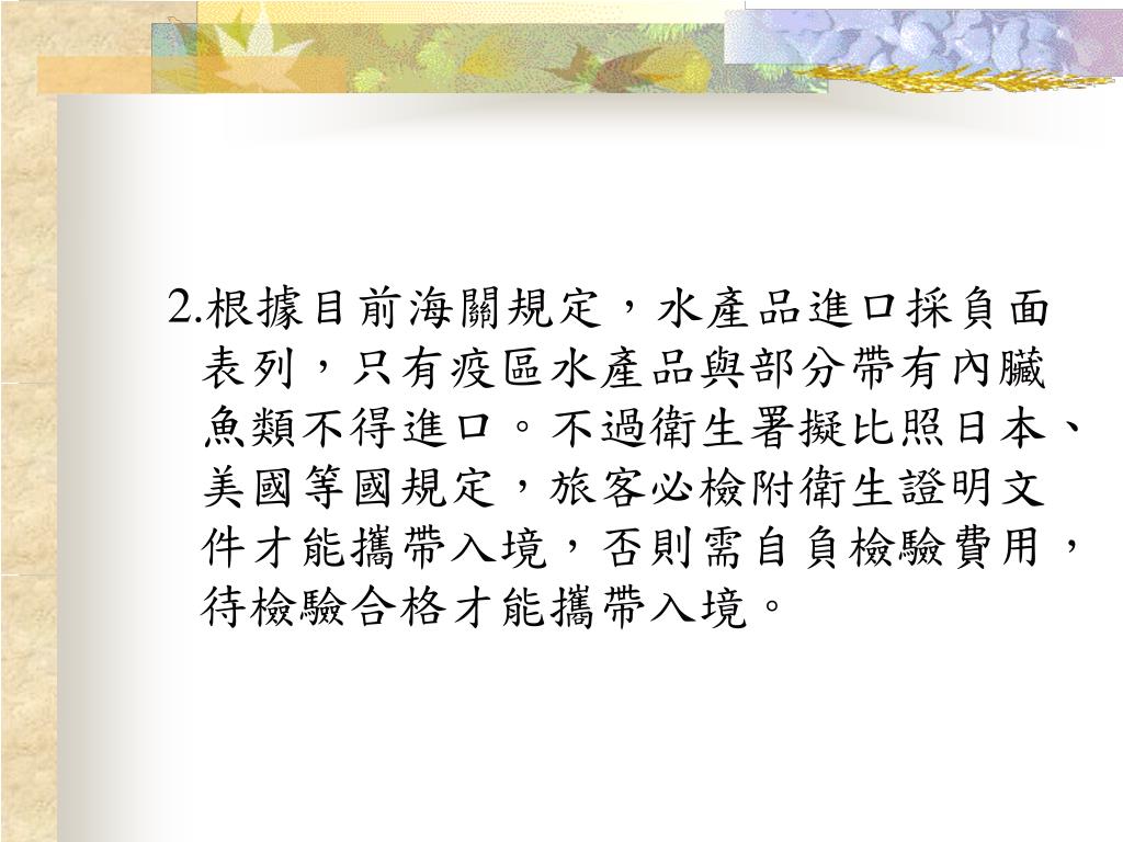 2.根據目前海關規定,水產品進口採負面表列,只有疫區水產品與部分帶有內臟魚類不得進口。不過衛生署擬比照日本、美國等國規定,旅客必檢附衛生證明文件才能攜帶入境,否則需自負檢驗費用,待檢驗合格才能攜帶入境。2.根據目前海關規定,水產品進口採負面表列,只有疫區水產品與部分帶有內臟魚類不得進口。不過衛生署擬比照日本、美國等國規定,旅客必檢附衛生證明文件才能攜帶入境,否則需自負檢驗費用,待檢驗合格才能攜帶入境。