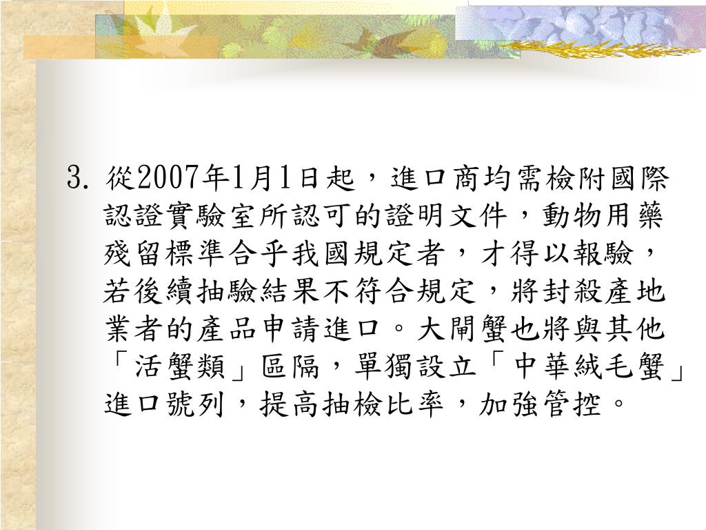 3.從2007年1月1日起,進口商均需檢附國際認證實驗室所認可的證明文件,動物用藥殘留標準合乎我國規定者,才得以報驗,若後續抽驗結果不符合規定,將封殺產地業者的產品申請進口。大閘蟹也將與其他「活蟹類」區隔,單獨設立「中華絨毛蟹」進口號列,提高抽檢比率,加強管控。3.從2007年1月1日起,進口商均需檢附國際認證實驗室所認可的證明文件,動物用藥殘留標準合乎我國規定者,才得以報驗,若後續抽驗結果不符合規定,將封殺產地業者的產品申請進口。大閘蟹也將與其他「活蟹類」區隔,單獨設立「中華絨毛蟹」進口號列,提高抽檢比率,加強管控。