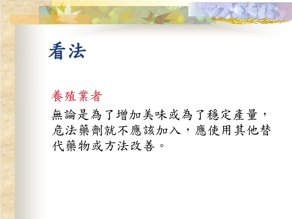 看法 養殖業者 無論是為了增加美味或為了穩定產量, 危法藥劑就不應該加入,應使用其他替代藥物或方法改善。