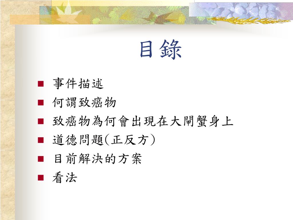 目錄 • 事件描述 • 何謂致癌物 • 致癌物為何會出現在大閘蟹身上 • 道德問題(正反方) • 目前解決的方案 • 看法