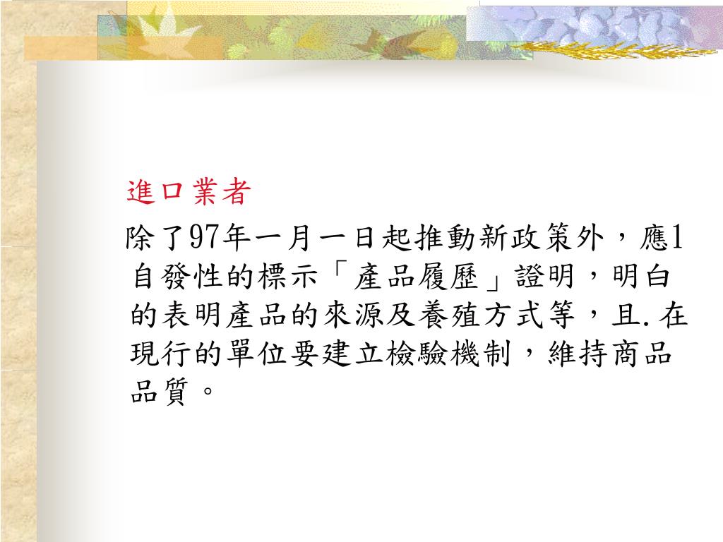 進口業者 除了97年一月一日起推動新政策外,應1 自發性的標示「產品履歷」證明,明白的表明產品的來源及養殖方式等,且.在現行的單位要建立檢驗機制,維持商品品質。