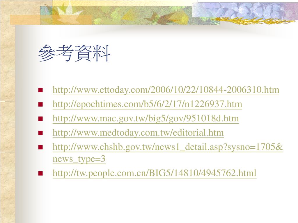 參考資料 • http://www.ettoday.com/2006/10/22/10844-2006310.htm • http://epochtimes.com/b5/6/2/17/n1226937.htm • http://www.mac.gov.tw/big5/gov/951018d.htm • http://www.medtoday.com.tw/editorial.htm • http://www.chshb.gov.tw/news1_detail.asp?sysno=1705&news_type=3 • http://tw.people.com.cn/BIG5/14810/4945762.html