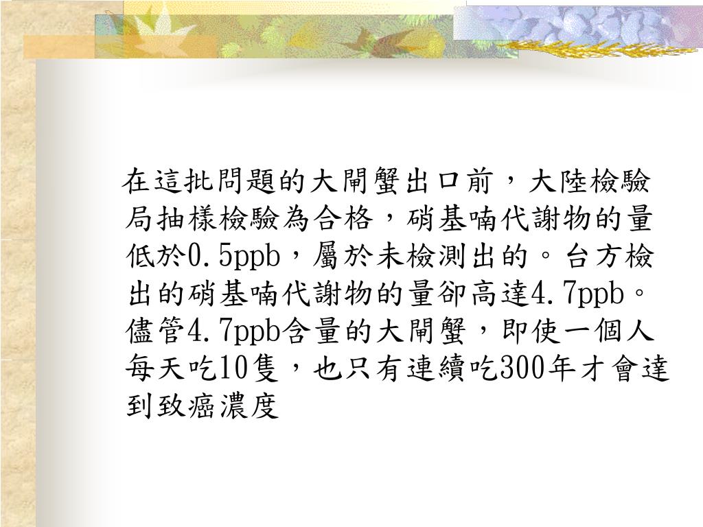 在這批問題的大閘蟹出口前,大陸檢驗 局抽樣檢驗為合格,硝基喃代謝物的量低於0.5ppb,屬於未檢測出的。台方檢出的硝基喃代謝物的量卻高達4.7ppb。儘管4.7ppb含量的大閘蟹,即使一個人每天吃10隻,也只有連續吃300年才會達到致癌濃度
