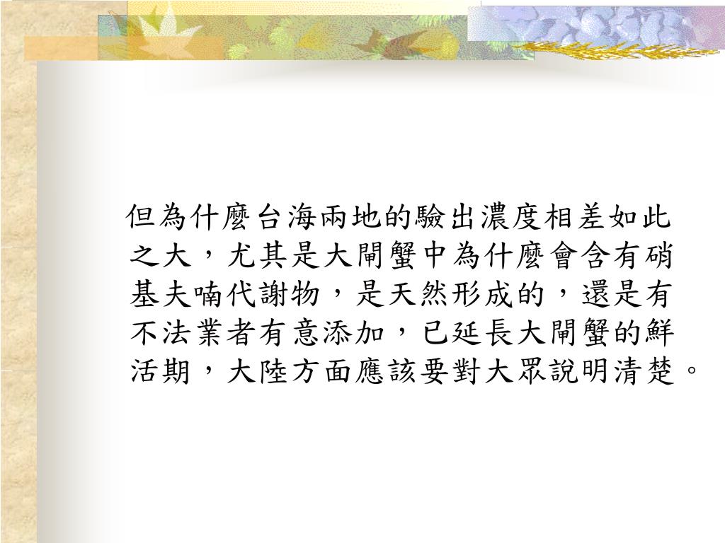 但為什麼台海兩地的驗出濃度相差如此之大,尤其是大閘蟹中為什麼會含有硝基夫喃代謝物,是天然形成的,還是有不法業者有意添加,已延長大閘蟹的鮮活期,大陸方面應該要對大眾說明清楚。