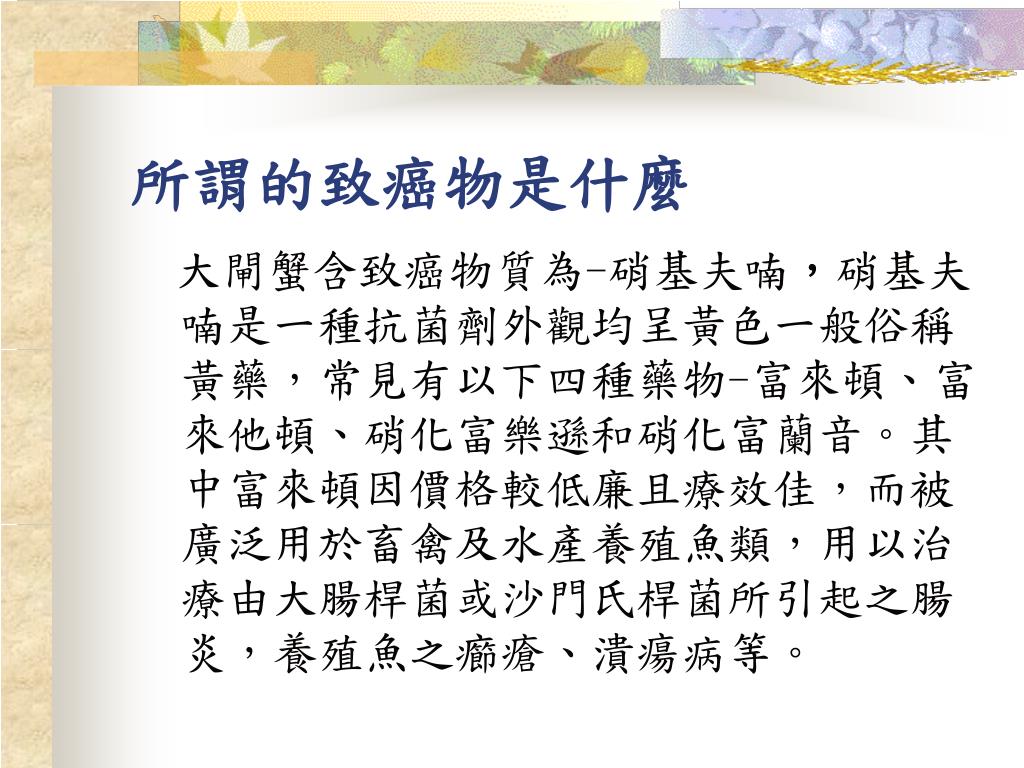所謂的致癌物是什麼 大閘蟹含致癌物質為-硝基夫喃,硝基夫喃是一種抗菌劑外觀均呈黃色一般俗稱黃藥,常見有以下四種藥物-富來頓、富來他頓、硝化富樂遜和硝化富蘭音。其中富來頓因價格較低廉且療效佳,而被廣泛用於畜禽及水產養殖魚類,用以治療由大腸桿菌或沙門氏桿菌所引起之腸炎,養殖魚之癤瘡、潰瘍病等。