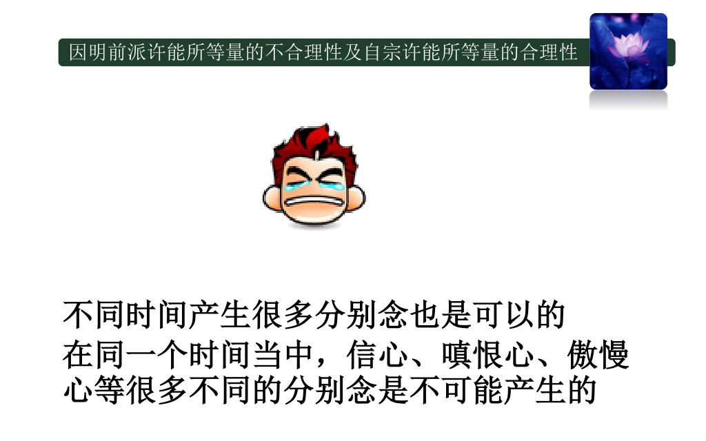 因明前派许能所等量的不合理性及自宗许能所等量的合理性因明前派许能所等量的不合理性及自宗许能所等量的合理性 不同时间产生很多分别念也是可以的 在同一个时间当中,信心、嗔恨心、傲慢心等很多不同的分别念是不可能产生的