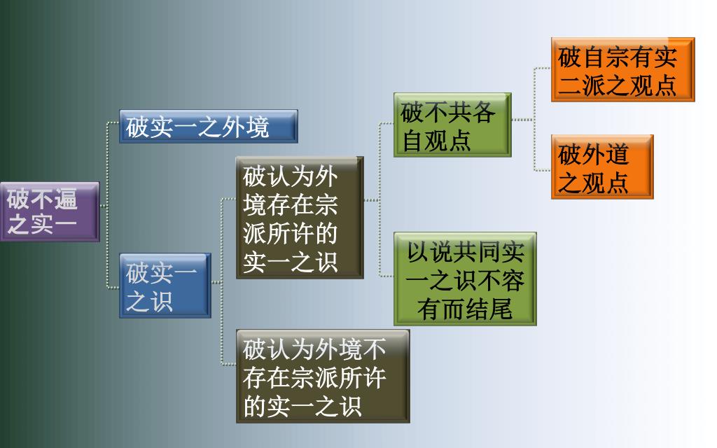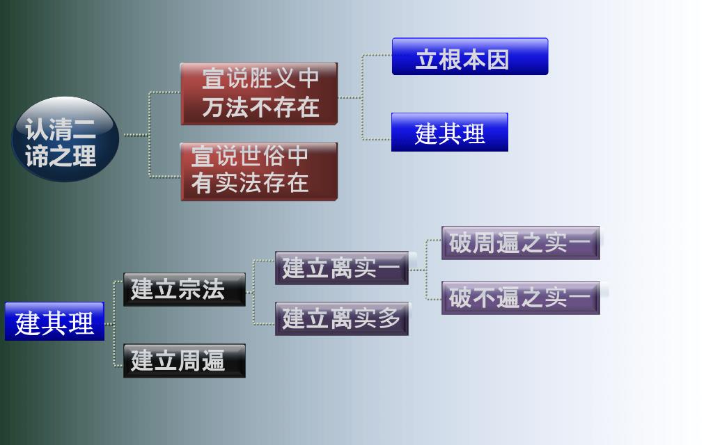 宣说胜义中 万法不存在 立根本因 建其理 建其理 宣说世俗中 有实法存在 认清二 谛之理 破周遍之实一 建立离实一 建立宗法 破不遍之实一 建立离实多 建立周遍