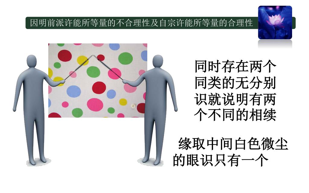 因明前派许能所等量的不合理性及自宗许能所等量的合理性因明前派许能所等量的不合理性及自宗许能所等量的合理性 同时存在两个同类的无分别识就说明有两个不同的相续 缘取中间白色微尘的眼识只有一个