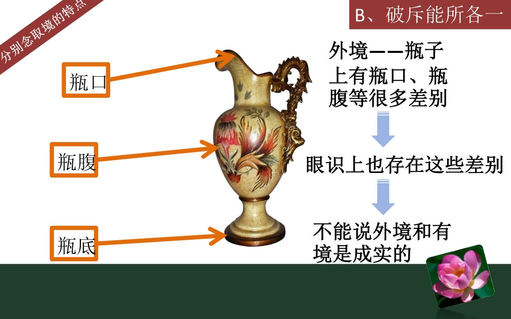 C、破斥异相唯识 分别念取境的特点 若取瓶腹的识与取瓶口的识是同类 瓶口 瓶底 瓶腹 取瓶子的有境与取水的有境也应该变成一个 取任何对境的识都应该成为一个