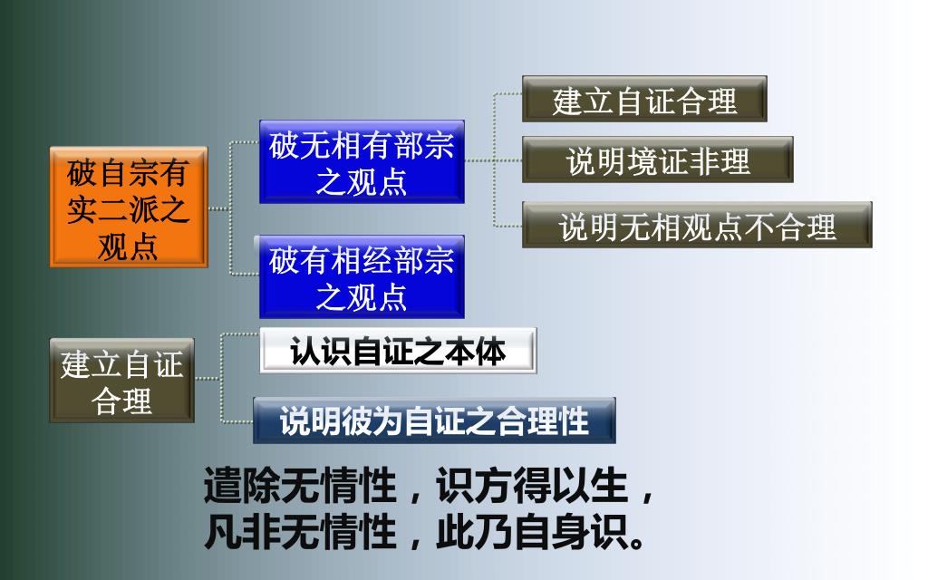 建立自证合理 破无相有部宗之观点 说明境证非理 破自宗有实二派之观点 说明无相观点不合理 破有相经部宗之观点 认识自证之本体 建立自证合理 说明彼为自证之合理性 遣除无情性,识方得以生, 凡非无情性,此乃自身识。
