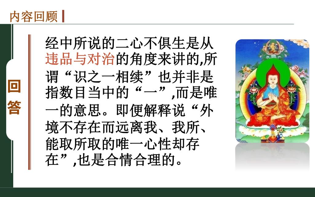 内容回顾 经中所说的二心不俱生是从违品与对治的角度来讲的,所谓“识之一相续”也并非是指数目当中的“一”,而是唯一的意思。即便解释说“外境不存在而远离我、我所、能取所取的唯一心性却存在”,也是合情合理的。 回答