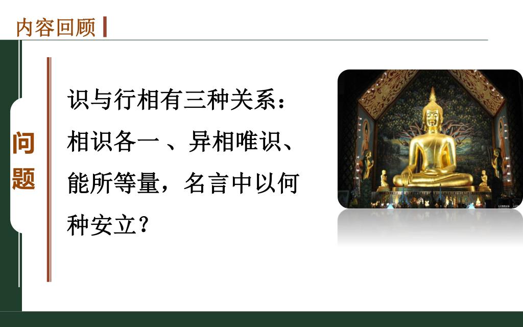 内容回顾 识与行相有三种关系:相识各一 、异相唯识、能所等量,名言中以何种安立? 请加入标题 问题