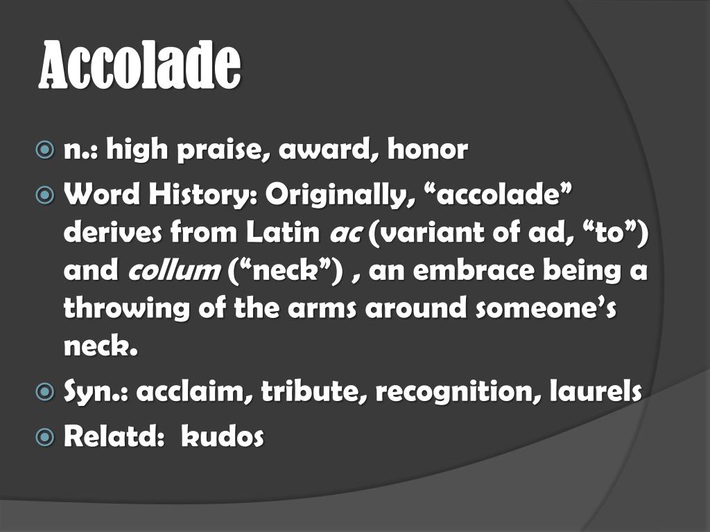 Accolade • n.: high praise, award, honor • Word History: Originally, “accolade” derives from Latin ac (variant of ad, “to”) and collum (“neck”) , an embrace being a throwing of the arms around someone’s neck. • Syn.: acclaim, tribute, recognition, laurels • Relatd: kudos