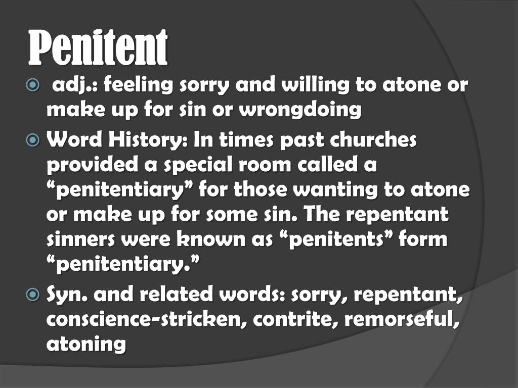 Penitent • adj.: feeling sorry and willing to atone or make up for sin or wrongdoing • Word History: In times past churches provided a special room called a “penitentiary” for those wanting to atone or make up for some sin. The repentant sinners were known as “penitents” form “penitentiary.” • Syn. and related words: sorry, repentant, conscience-stricken, contrite, remorseful, atoning