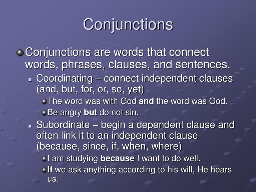Conjunctions • Conjunctions are words that connect words, phrases, clauses, and sentences. • Coordinating – connect independent clauses (and, but, for, or, so, yet) • The word was with God and the word was God. • Be angry but do not sin. • Subordinate – begin a dependent clause and often link it to an independent clause (because, since, if, when, where) • I am studying because I want to do well. • If we ask anything according to his will, He hears us.