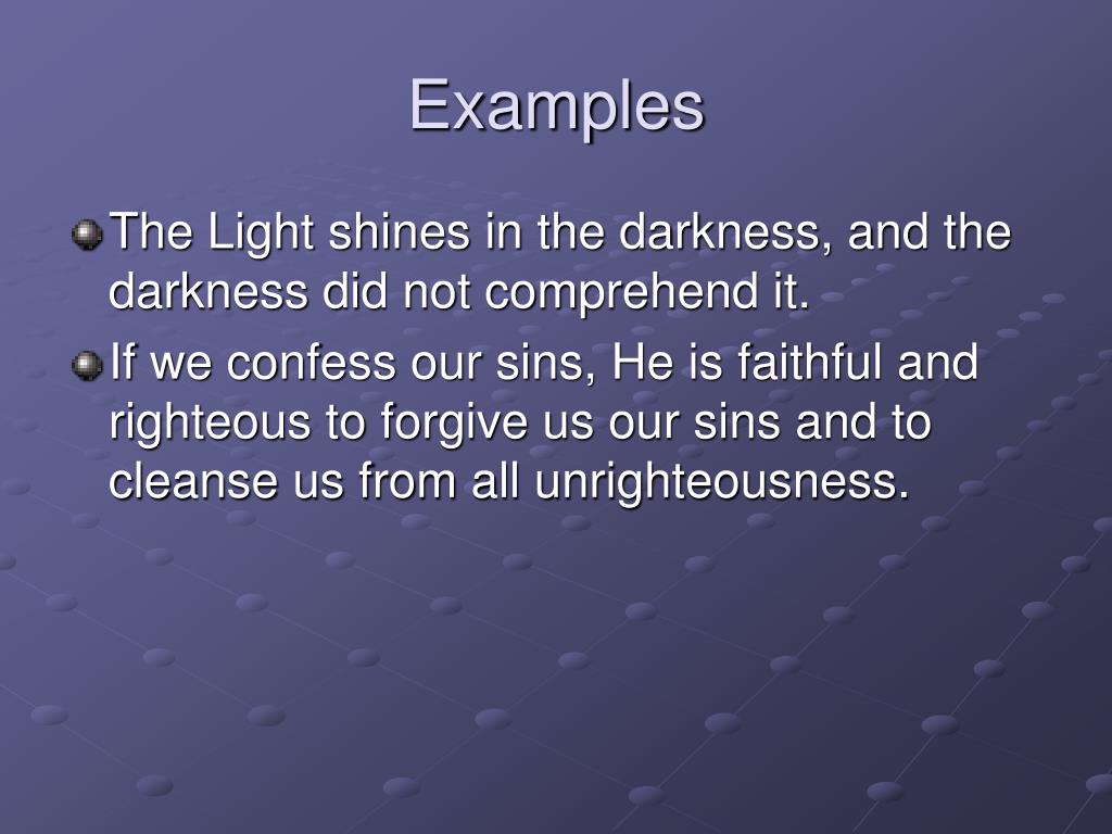 Examples • The Light shines in the darkness, and the darkness did not comprehend it. • If we confess our sins, He is faithful and righteous to forgive us our sins and to cleanse us from all unrighteousness.