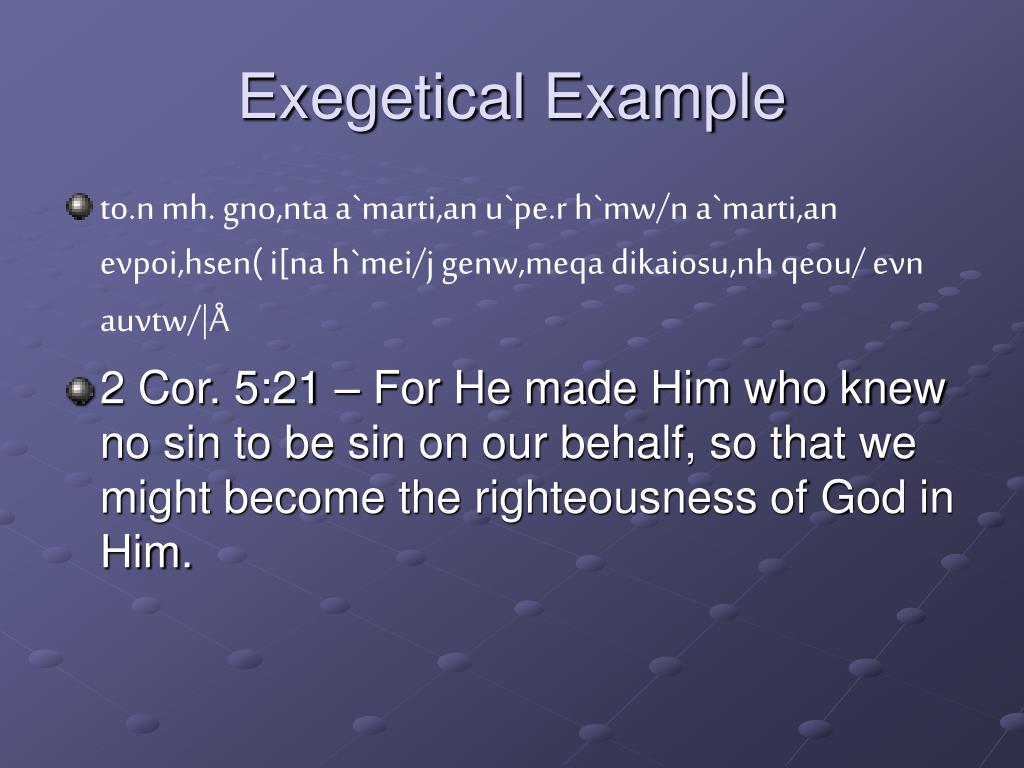 Exegetical Example • to.n mh. gno,nta a`marti,an u`pe.r h`mw/n a`marti,an evpoi,hsen( i[na h`mei/j genw,meqa dikaiosu,nh qeou/ evn auvtw/|Å • 2 Cor. 5:21 – For He made Him who knew no sin to be sin on our behalf, so that we might become the righteousness of God in Him.