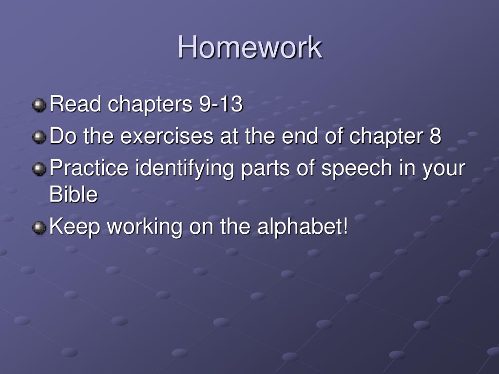 Homework • Read chapters 9-13 • Do the exercises at the end of chapter 8 • Practice identifying parts of speech in your Bible • Keep working on the alphabet!